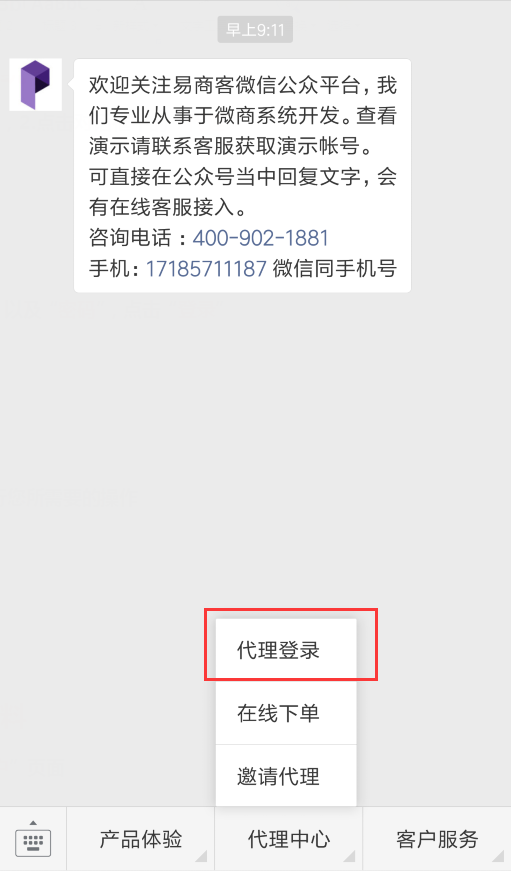 首先关注并进入公司微信公众号,1.点击下方菜单栏的“代理中心”,2.找到二级菜单中的中的“代理登录”选项,点击进入代理登入页面。