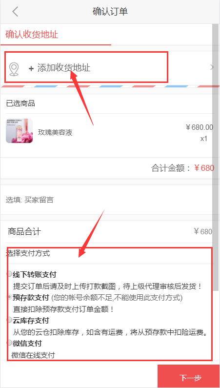 点击“结算按钮”跳出订单详情,添加您的收货地址,选择您所需要的支付方式,点击“下一步”进行付款,最后核对好您的提货信息,确认订单无误后,“确认支付”购买